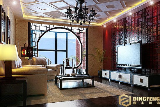 吊顶采用了菱形的设计方式,这样就跟整个客厅的中式风格紧密地联系在了一起。配上电视墙大面积的红色,使得整个客厅具有了中式的现代感来。