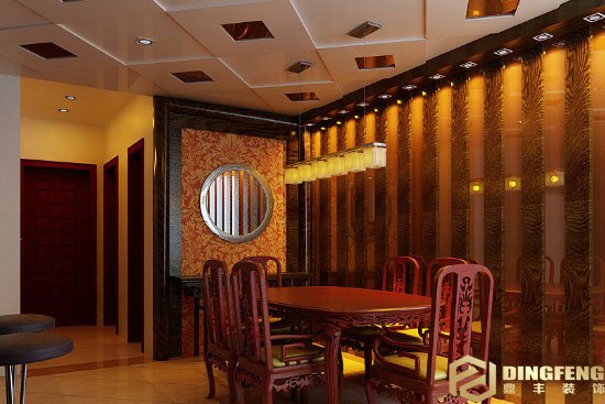 这个中式的吊顶跟一般的中式吊顶具有很明显的区别。方形吊灯的设计,配上烤漆黑色的吊顶,让整个餐厅呈现出一种不一样的中式魅力来。